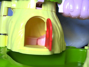 全景。どことなく南国チックな雰囲気である。屋根部分はポップアップして、中にはみはらし台がある。右手の「3だんいわ」の階段を登り、雲(ピンクの部分)をつたって見晴し台へ。画像奥の滑り台でプールに飛び込める。手前中央の切り株には別売のちいさなおうちをドッキングさせることができる。
