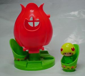 | 当時価格:¥980 | やはりまだ初期の時代。1k以下という低価格のハウスとお友達セット。多くの価格帯に対応しているのもさすがである。ギミックもとことん簡略化されているが、チューリップ型のおもちゃが展開してハウスになるコンセプトは忠実に守られている。本体カラーはピンクと赤の2種類があり、パッケージも異なるものになっている。低価格ゆえ相棒の動物は付属しない(しいていえば蝶なのか?) |